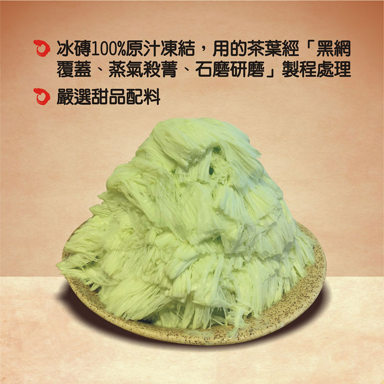 ◇ 嚴選茶業經黑網覆蓋、蒸氣殺菁、石磨研磨製成綿密雪花冰。