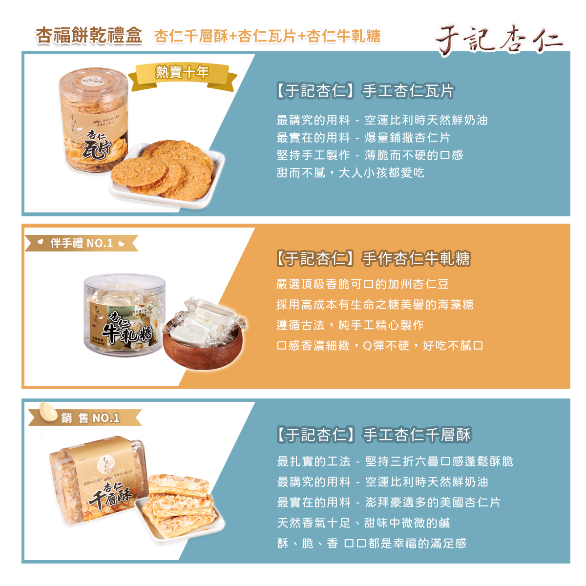 ◇ 杏仁千層酥、杏仁瓦片、杏仁牛軋糖各乙盒。
