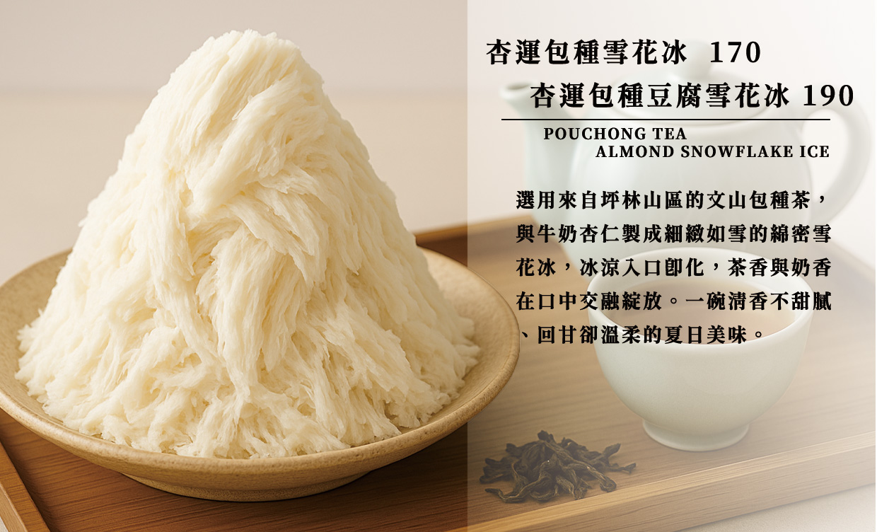 與牛奶杏仁製成細緻如雪的綿密雪花冰,